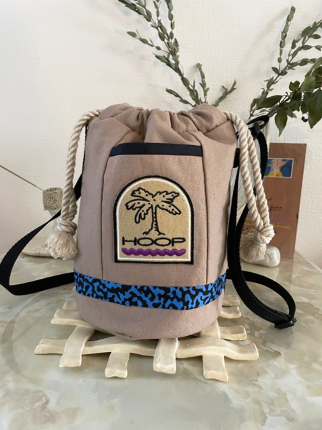 hoop定番の丸底巾着ショルダー 新しいバージョンはショルダー部分がベルトになっていて長さ調節可能 帆布生地とビンテージ生地を切り替えていて前後にポケット ポケットにhoopワッペン ワッペンは蓄光糸で部分的に発光します 小ぶりですが長財布もすっぽり入って割と収納力があります サイズ 丸底直径 15㎝ 高さ 23㎝ 素材 コットン 帆布 カラー ベージュ