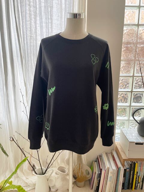 プリントの色は薄い蛍光グリーンで立体感のある発砲プリントで前後に散りばめています