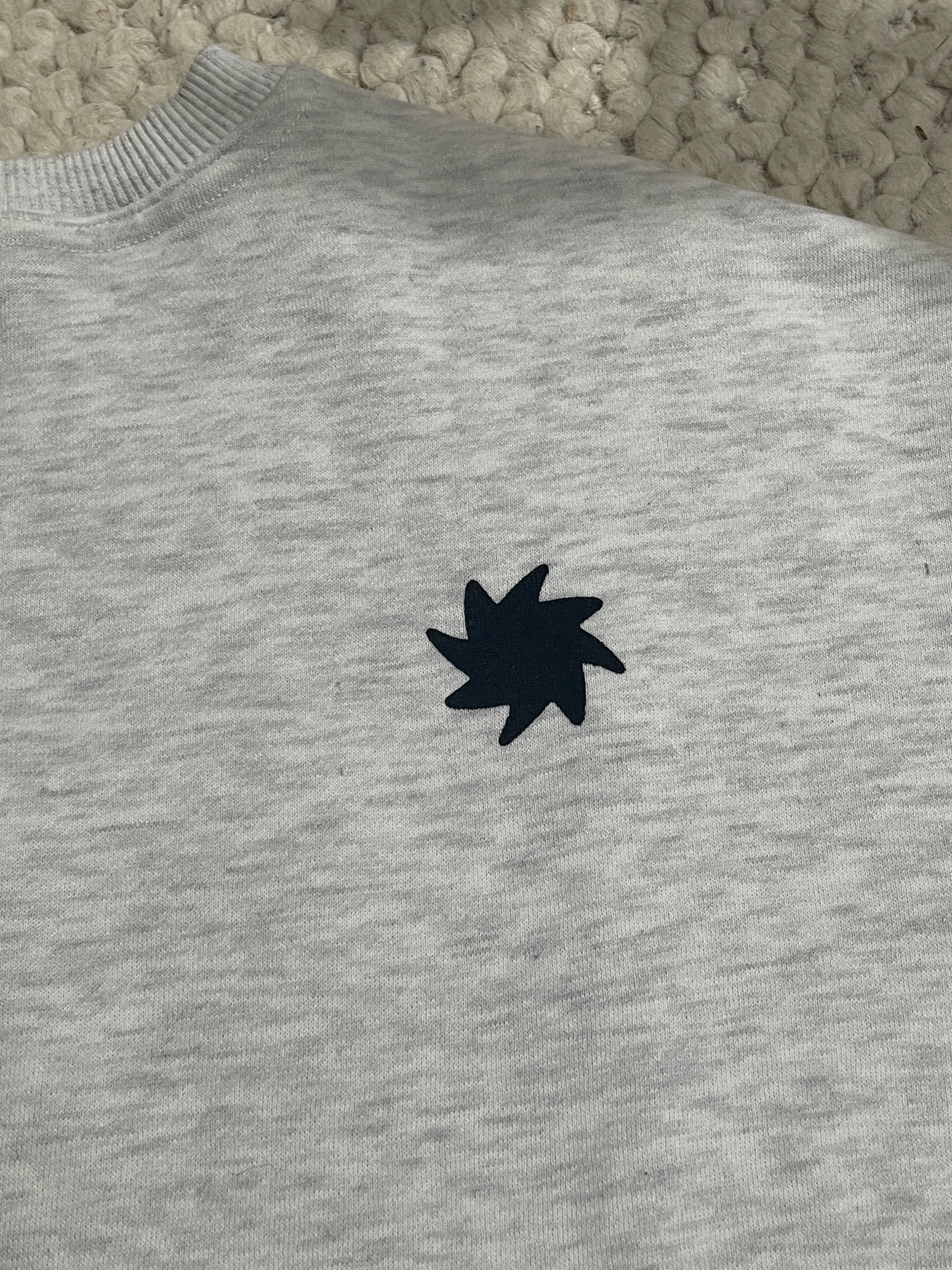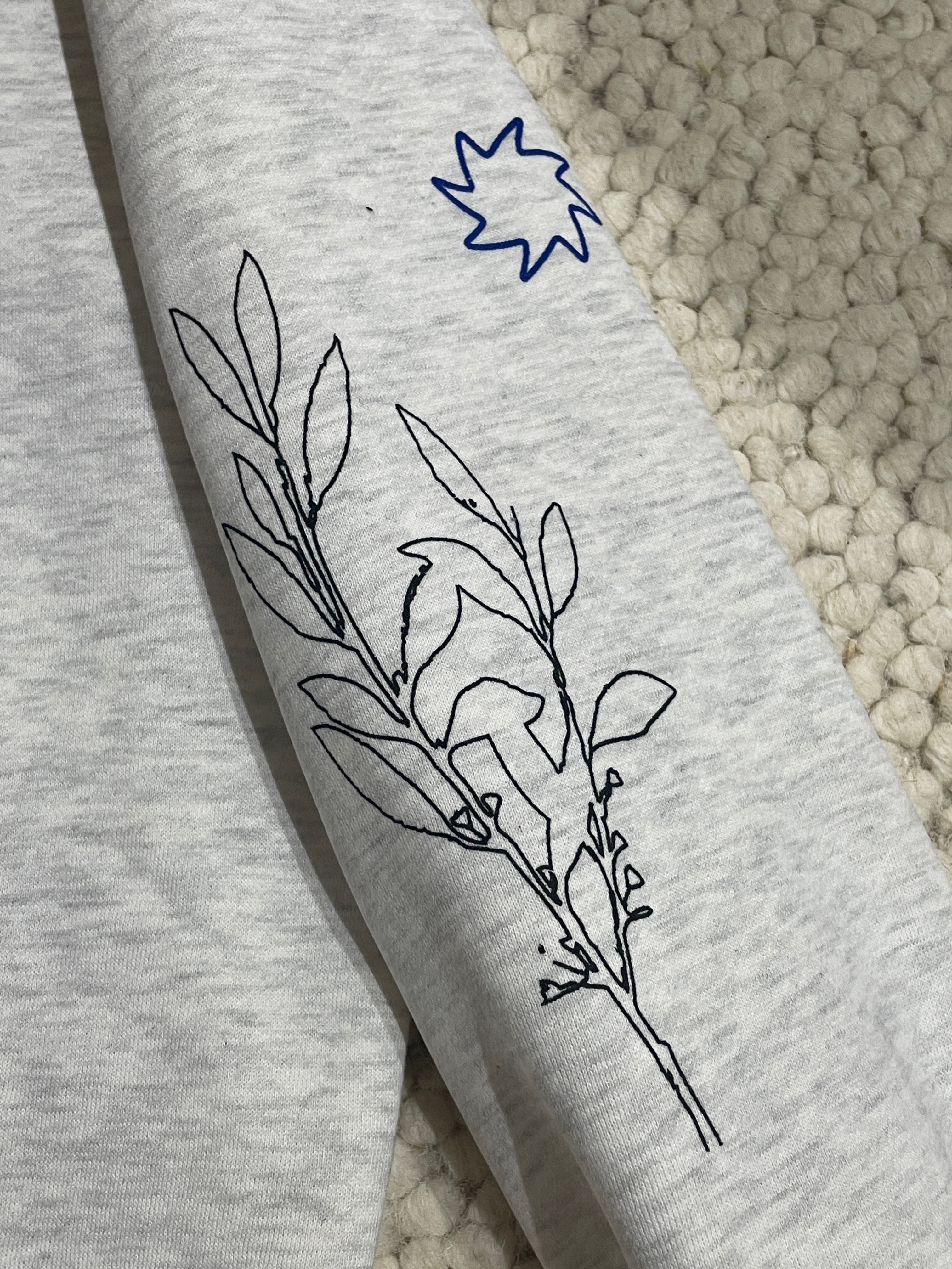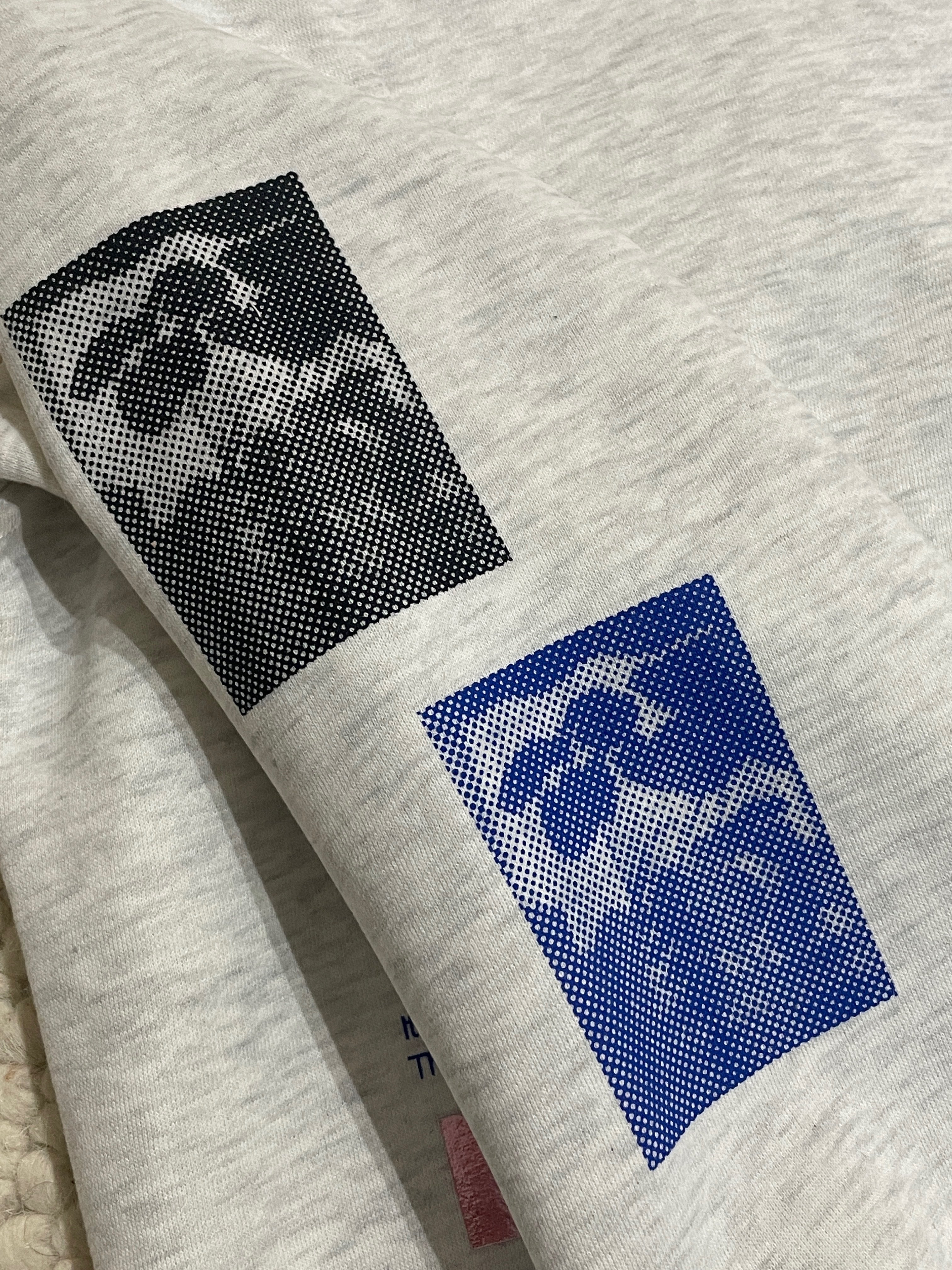 フロント、袖、バックに黒と青でシルクスクリーンプリント